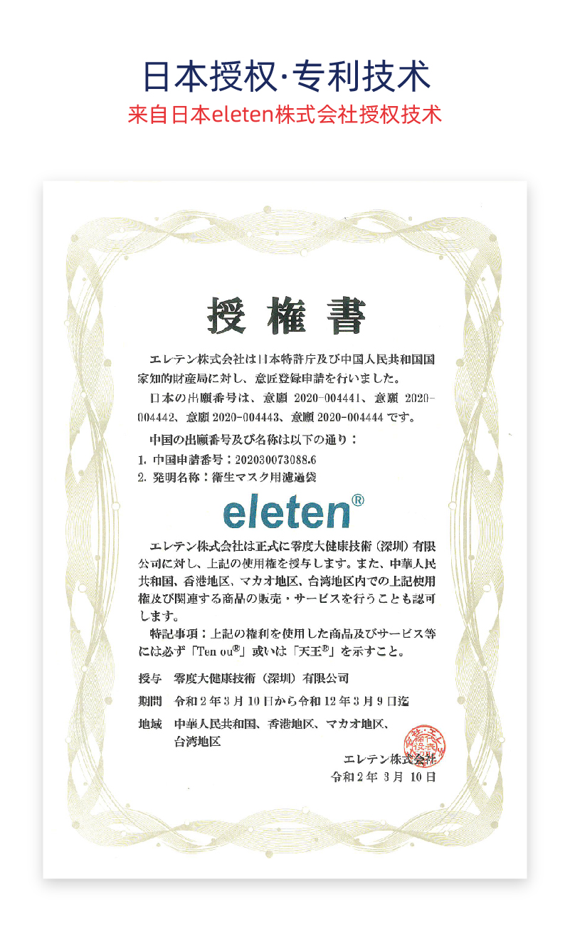 采用日本eleten國際PCT專利申請“零度”技術使其每片濾紙中所含藥量極低趨近于“零”,確保藥物對人體沒有任何副作用,同時又保持了藥物的消毒殺菌功效不變。采用納米膠囊技術將消毒殺菌劑(例如:75%乙醇)包裹在膠囊里,植入到紙制過濾芯片中形成溶出型固體消毒殺菌芯片,主動殺菌。